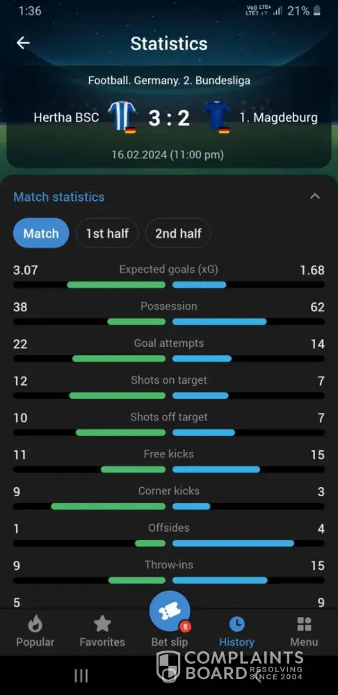 Dear advisor A football game between hertha bsc vs 1. fc magdeburg Was used by me in a multi bet slip ( The betslip number is [protected] ) The corners from the 1xbet shows different from the official page of the league and GOOGLE itself This is how it is " The total corners are 9 & 4 - in total ( end of the match) 3 & 2 in first half The above is displayed...