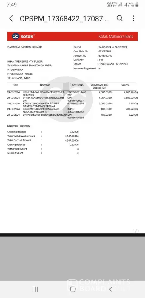 I am writing to address a concerning issue regarding two transactions I initiated through the 1xbet app, transferring 5000 INR each via PhonePe. The first transaction was made on February 10, 2024, at 12:22 AM to the UPI ID [protected]@paytm (UPI reference no. [protected]), and the second transaction occurred at 12:31 AM on the same date to the UPI ID...