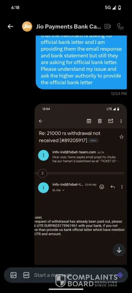 I have already contacted support team regarding this issue and sent them multiple bank statements from time to time. Only reason iam here is they aren't listening they are purposely ignoring my issue to hide the fraud done by the agent or support team themselves maybe. Now its 6 months do you think iam stupid from 6 months your specific time period still isn't over. Please give a reasonable response next time which involves returning my money to my gaming account, because I had contacted my bank multiple times and they have inquired multiple times and confirmed the payment was successful. I even raised a chargeback but your 1xbet agent rejected my chargeback confirming he did receive the payment but didn't deposit it into my account. I have already sent you the proof of payment being successful confirmed by Banking regulatory body i.e NPCI and regarding my money returning back your agent denied my chargeback and i didn't receive a single rupee till date. So please just give me my deposit into my account because transaction was successful and you have wasted my 6 months. If you can't deposit the amount at least give me promo points equal to my deposit amount i don't even need any compensation amount I just need the amount that i deposit into my gaming account. It's been three years I have used 1xbet but this is the first time this has happened to me so i still have good faith in 1xbet not the customer support because the always behave oddly that's the only reason i have come here expecting a higher authority from 1xbet would help me ðŸ™.