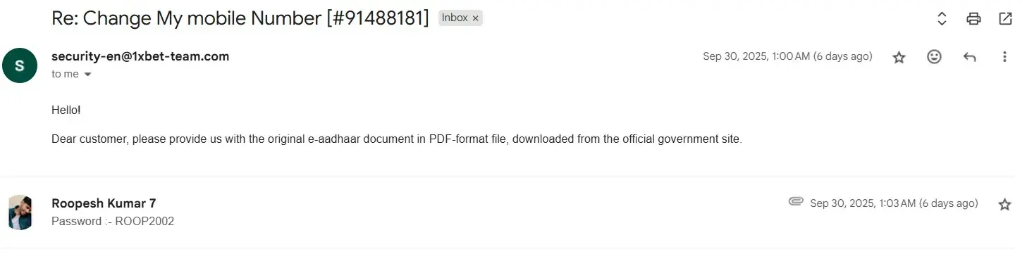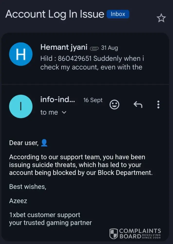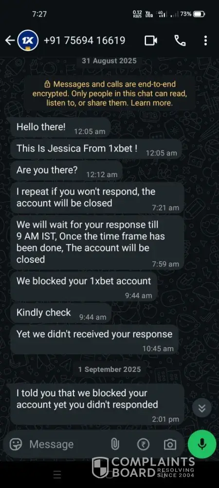 Hi, My 1xBet account (ID: [protected]) was blocked on 31st August 2025 because I did not respond to a WhatsApp message from the payments team, as I was out of town for work. Later, when I checked my account, I found it was blocked. I tried responding on WhatsApp, but the number was offline. When I contacted customer service, I was informed that my account...