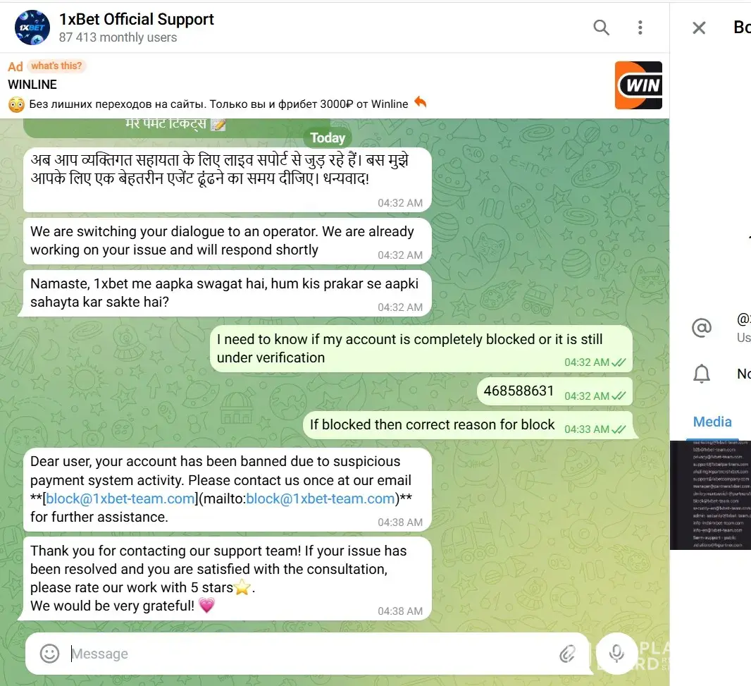 My experience with 1xbet customer support👇