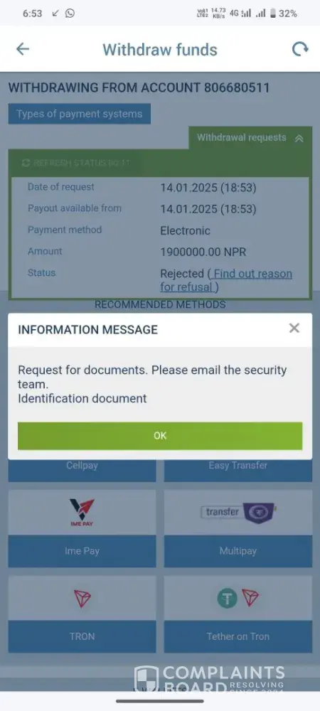 have deposited npr 880006.84 (usd 6494.76)through cryptocurrency exchange platform binance and i played online cashino called baccarat and i won certain amount while withdrawing the amount it says documents required email security team then i started mailing them i provided alll the documents about my 1x id and from where i deposited the amount that i...