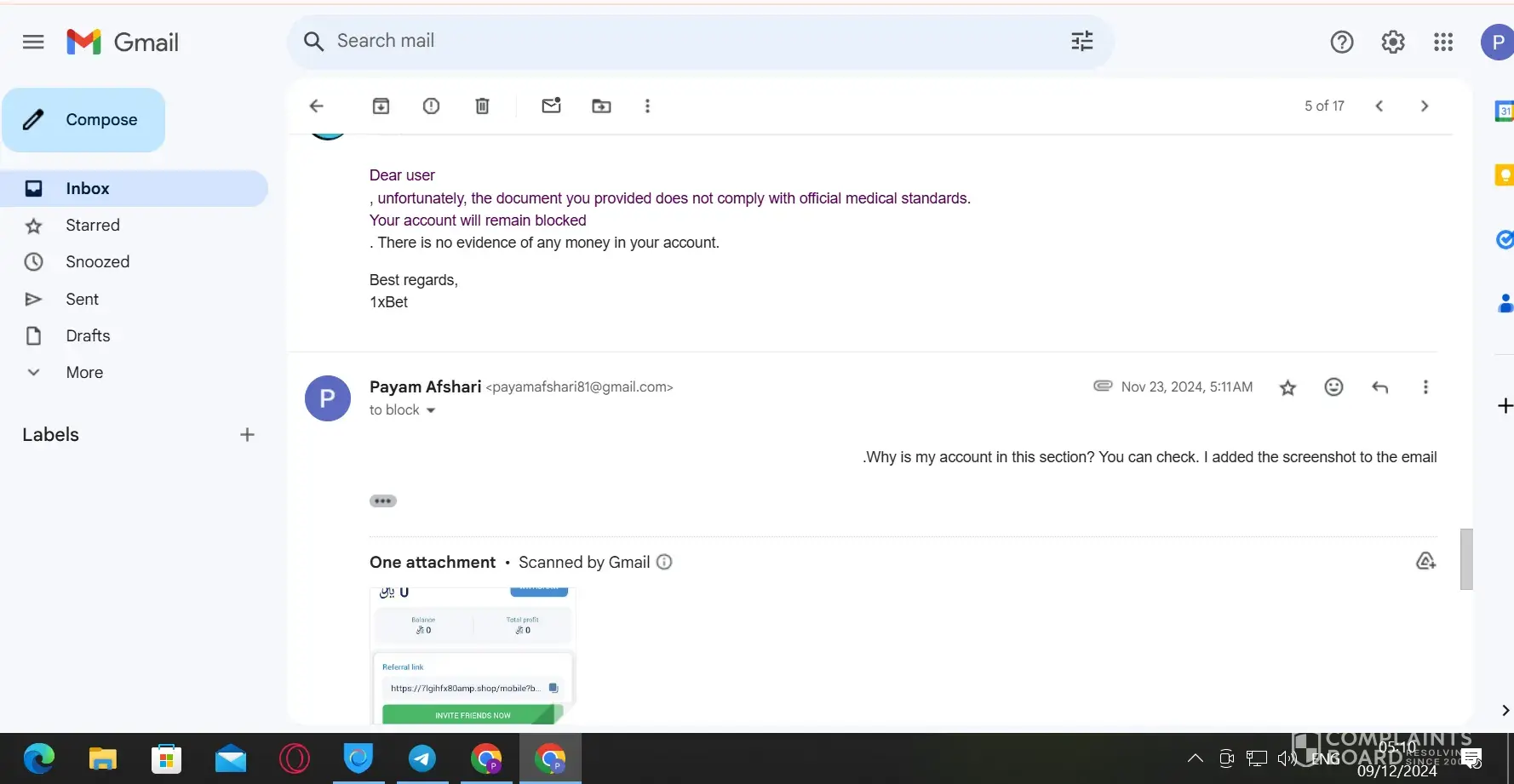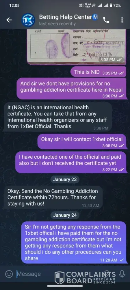 I created one account by using One click registration option. I didn’t fill up my personal profile even No phone number and email was added in my account. Then I made deposit of 149000 bdt taka from our local agent. That agent was also a fraud as he notice to 1xbet security department as that transaction wasn’t made by him. For this, 1xbet company freeze my account and money. I mailed [protected]@1xbet-team.com. Security Department asked for my documents and selfie with my documents. I submitted everything they asked for.