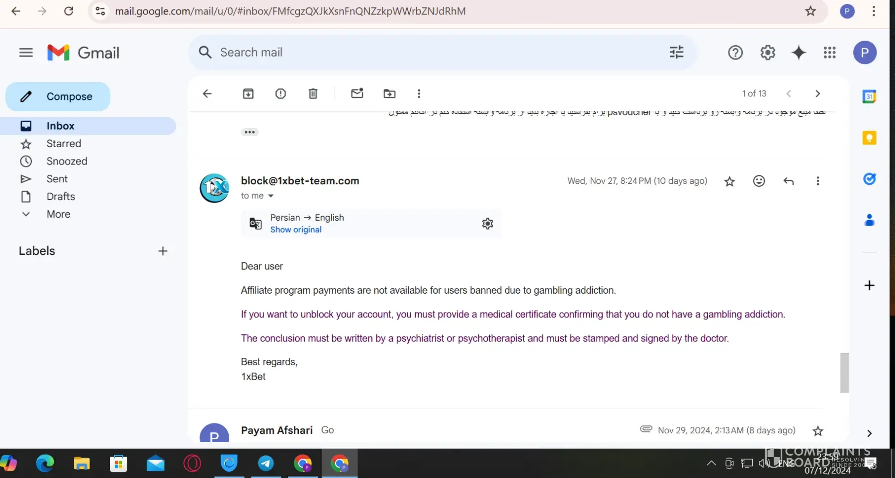 I complaint via offical 1xbet gmail and phone call and via chat service to but thay are saying we a working on it it is a some tachnical problem and we sent your request to a financial department and all, but still problen not solved
