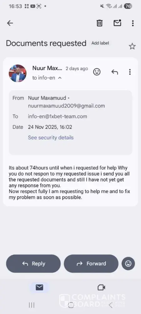 Thank you for responding to me. I have verified my deposit proof since I created the account. I have sent all the receipts of the money I deposited to 1xbet security team. Now I am sending them to you. Please check. But the problem is that 1xbet security team is not responding to my email. Pls try to understand that they are not responding to me. I have been complaining to their email and they have not responded for a month and more.