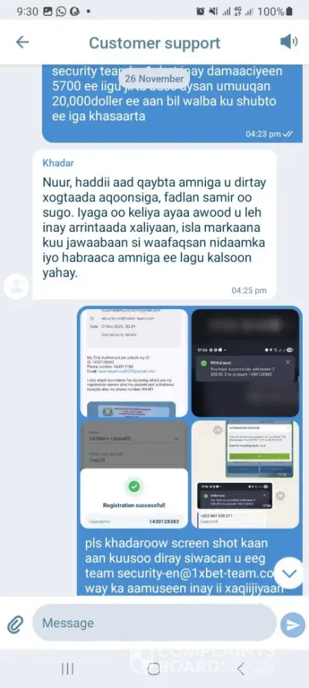 I registered with the 1xbet company in Somalia on 22/10/2025. I started playing casino and 1xgames with my mobile ID and deposited a lot of money, about 20,000, and I have proof of the previous days. It started that sometimes I couldn't withdraw the money, but when I continued to play and lose money, I thought I would withdraw a little, it would be resolved, but the problem increased and finally my account was made Authorized by the security team, and get sms to contact the security team. I contacted them and they said send me your documents and proof of receipts of the money you deposited or withdrew. I sent all the documents they requested from me, when they received my evidence and the documents I had sent and saw that everything was correct, they kept quiet and did not respond to me and I do not know why. I created my ID on 22/10/2025 and deposited 20k dollars to 1xbet and now my account is blocked for 5,788 dollars, so I am asking anyone who can help me with my issue to help me.