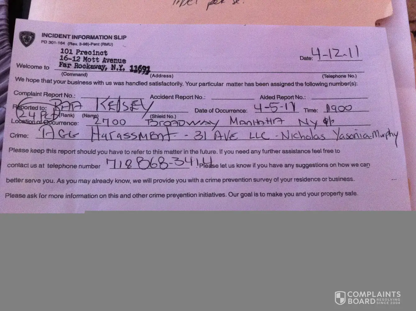 3. Filed an Aggravated Harassment Complaint with The New York City Police Department. I am tired of these people posting defaming statements about myself. Restraining order is next. Nicholas Yasonia-Murphy, 31 ave llc employees can answer to the police.