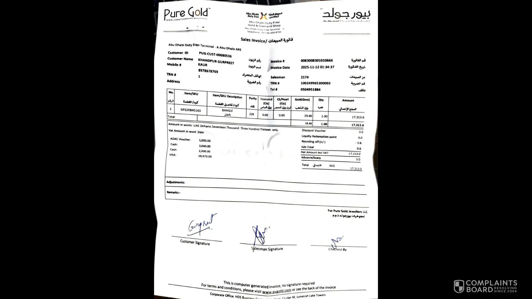 Hi, I had purchased a bangle from the Pure Gold Airport store on 12-Nov-2025. I have been duped with double the charge on the item. Please note that for a Bangle of 19.4 Gms, I was charged 17313.6 AED. Whereas, I should have been charged around 8890 AED. Since I was in a rush to board my flight I was unable to concentrate and trusted the store workers - BIG...