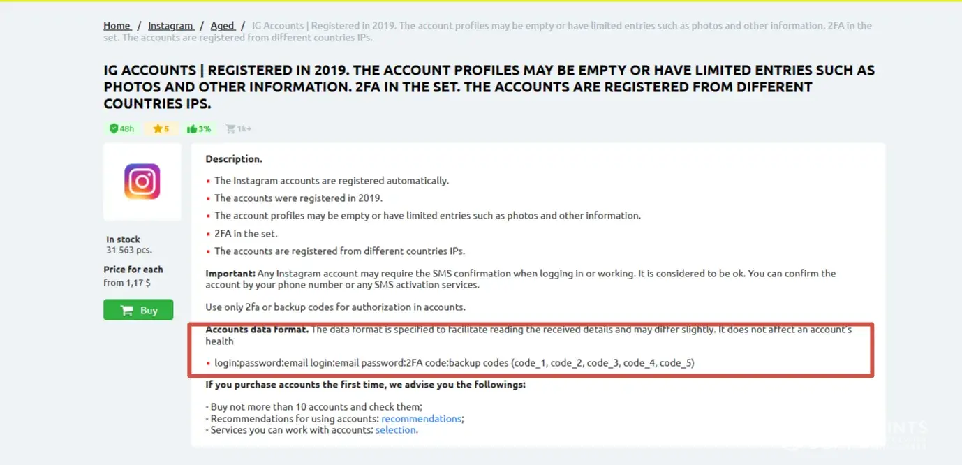 I purchased Instagram accounts dated 2019. The listing stated the format as follows: login:password:email login:email password:2FA code:backup codes (code_1, code_2, code_3, code_4, code_5) However, when I received the products, the accounts were delivered in the following format: login:password:2FA The delivered accounts do not match the format described...