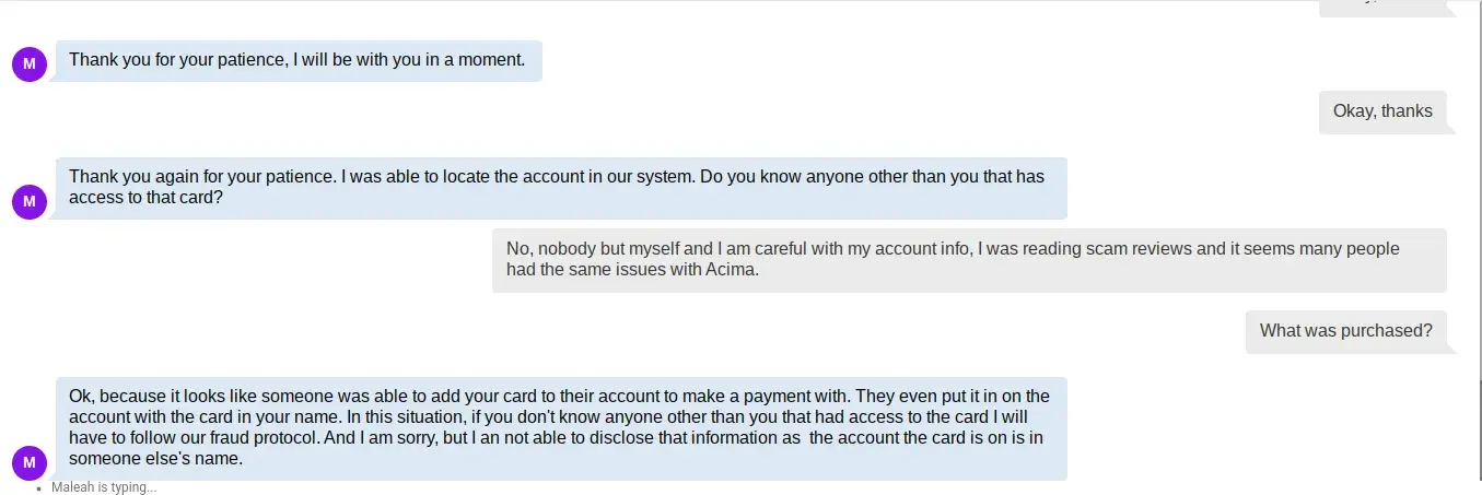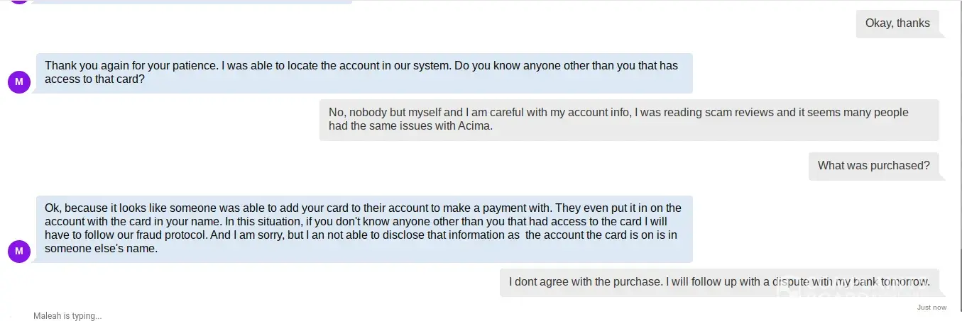 Someone had used my bank account information to open an account at Acima. I called them immediately after receiving the first email from them about my new account which I never applied for. I told them about my bank account info was being compromised and used to open an account with them. They told me that they really scrutinize the application for credit...