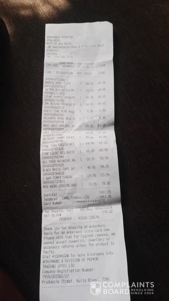 I bought a shirt and t-shirt it was 2 pack at Wonder park mall it has a quality problem. Alexandra they refuse to take it they say I have to go back to wonder park. I'm getting confused cause I can do lay- bey at wonder park and pay at Alexandra or anywhere but I can't return anywhere I don't even know when I'm going to be able to go to wonder park I will after a month or two and they will tell me they can't refund cause the product its been written of the system. I even had to fight to get my slip back, they were refusing to give me my slip back and they telling me that I won't be able to return it without the slip can someone give me a clear answer. Cause now I'm stuck with a default product and I can't return it anywhere but buy, pay at any Ackermans store I don't understand and Cashiers are allowed to chew gums on the sales floor while saving customers its unprofessional and irritating two Cashiers were chewing gums while we had wait on a long queue watching them chewing their gums the supplier they didn't do their job perfect and I'm the one who's getting punishment