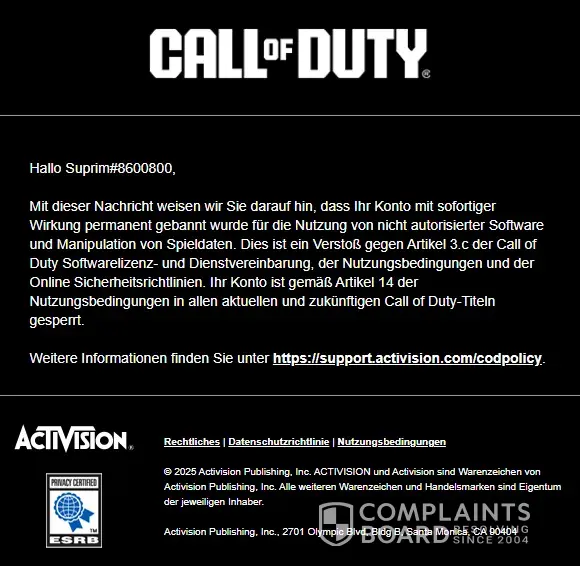 I have received a notification that my Call of Duty account (Username: Suprim#8600800) has been permanently banned due to alleged use of unauthorized software or game data manipulation.