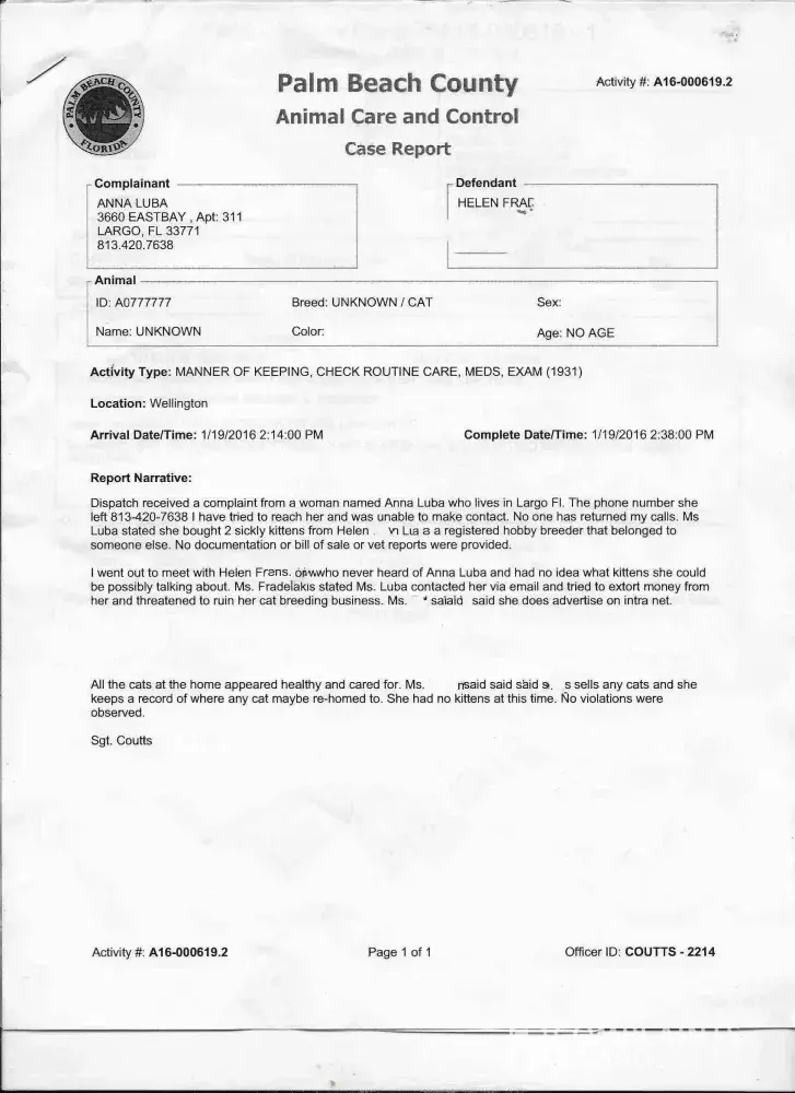 Palm Beach County Animal Control inspection of Adoraelves Cattery 2016 Dispatch received a complaint from a woman named Anna Luba I tried to reach her and was unable to make contact. No one has returned my calls. I went out to Adoraelves Cattery and talked with Helen and found Ms Luba is extorting and scam Adoraelves cattery for money. All the cats at the home are healthy and cared for No Violations were observed