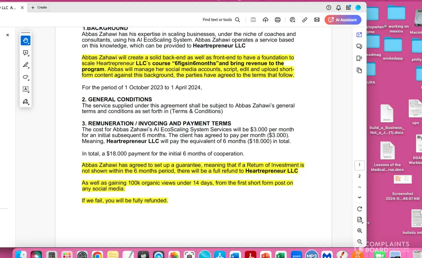 The contract stated he would bring revenue to my EXISTING program, - brought ZERO. The contract also stated I would get 100,000 organic views in 14 days on social media, - got NONE. He overbilled as the contract was for 18k and he has billed 24k; he then ghosted me, ignoring the overbilling and guarantee, and has been reported to the FBI for fraud.