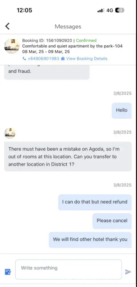 Once again, we would like to take this opportunity to express our sincere regrets for the inconvenience caused by hotel. We understand that this situation was very unpleasant and caused a lot of stress. But we would like to highlight that you could book the room only as hotel and our supplier uploaded it for sale. It is hotel's responsibility to close a room for sale if it is not anymore available. Till the phonecall from hotel on 03 Aug, Agoda had no information that there is any problem with the booking.