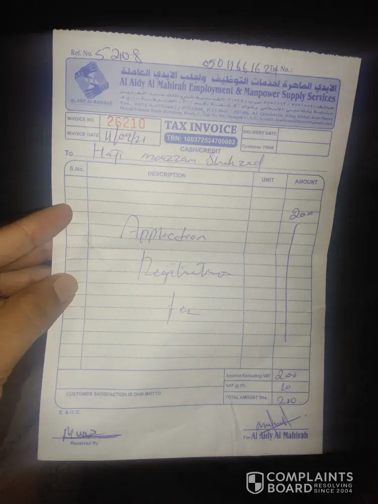 On 02/06/11 I went their seen the named was “AL AIDY AL MAHIRAH EMPLOYMENT & MANAGEMENT CONSULT SERVICE S†there Ms.Samira has taken a small interview kind, , she told me to registered with them by paying Dhs.100, job is for Customer Care Executive, She assured me that she will fix interview within few days, 8th june I got call from the same office landline number to meet at there office before 3’ o clock, so again I visit their on 9th june. I met with Mr.Rehan, again he asked few interview kind of question like I want to be on husband visa or employment and he said in next few days he will fix a meeting with the Company Oriential group of company but for this I need to pay 300 Dhs. Assured job with salary 3500 on husband visa.
