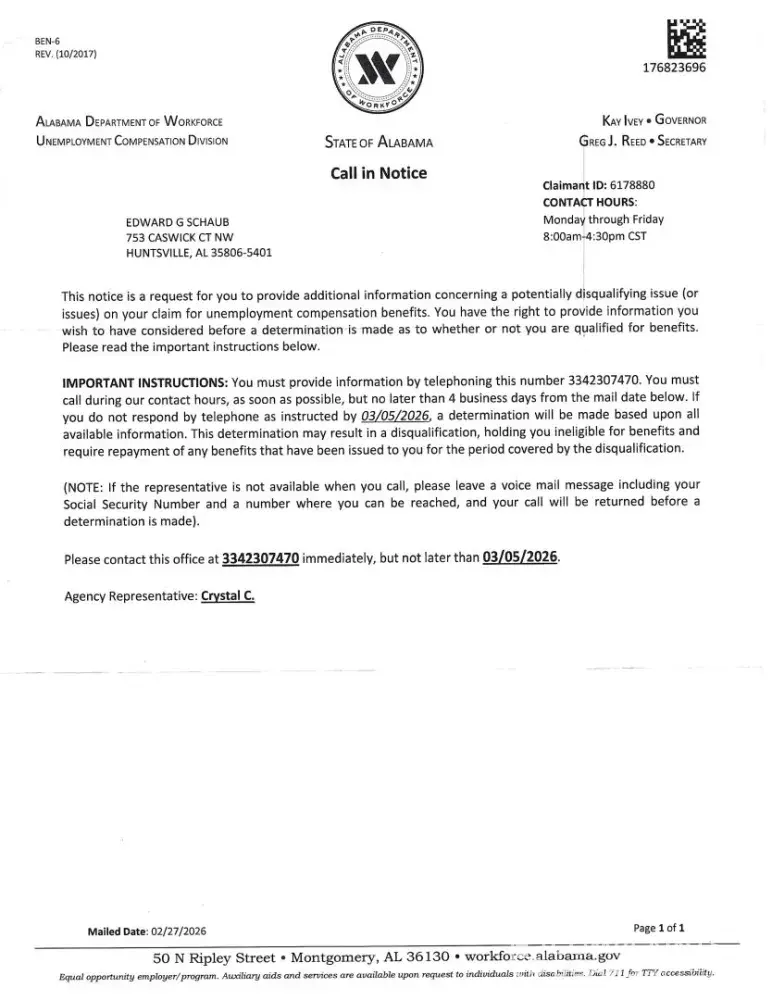 I lost my job 12/19/2023 when the company I worked for closed its local office. Since that time I’ve only received ONE payment. THAT was a fight. Kept being told by Jennifer on the phone that she would pass my info for review to her supervisor but she’d never name them and wouldn’t tell me how to get in touch with them. I made some errors and she said she put corrected notes in file but still no compensation after I have PAID INTO THE STATE FOR 40 years as I’ve worked that long. I’ve NEVER before been unemployed. Jennifer on two phone calls tried to get me to say that if I got Alabama unemployment compensation OR GOT A JOB that I WOULD GIVE UP MY SOCIAL SECURITY BENEFITS which by federal law they can’t touch (I’m 64 and am drawing Social Security now).