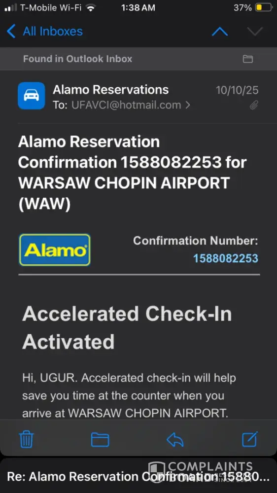 #1588082245 confirmed on 17 October 2025 at WAW airport Name Ugur Avcikurt . I walked to Alamo office . Employee told me that he can not rent me because I lack an International drivers licence. Then he said next door unknown car rental company would rent me with just my US Drivers licence that they don’t follow the rules. I checked and found an...