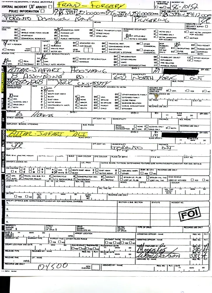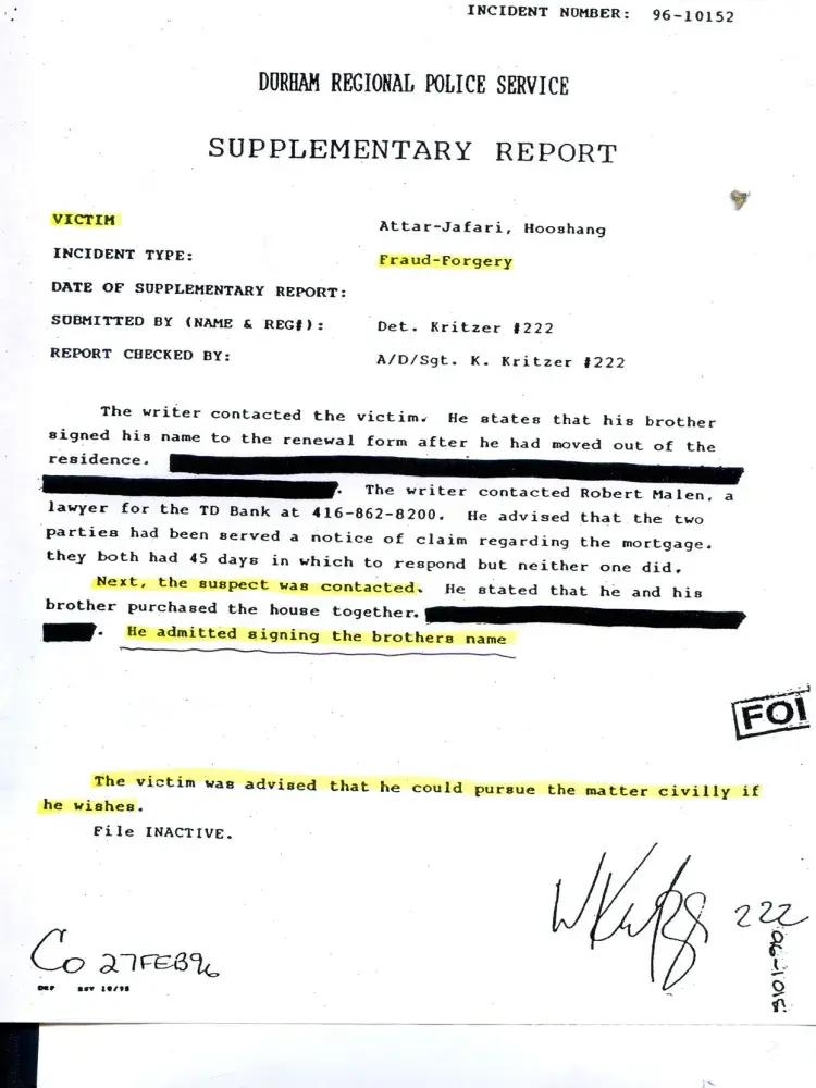 Ali Attar Jafari alias Amir Jafari forged signature on a mortgage renewal document without consent and uttered the fraudulent document to TD Bank in a financial transaction. He admitted to signature fogery on the mortgage renewal document when questioned by Detective Kritzer of Durham Regional Police Service in Ontario Canada. Police report evidence posted here is obtained pursuant to Freedom of Information Act from the court files of Ali Attar Jafari.