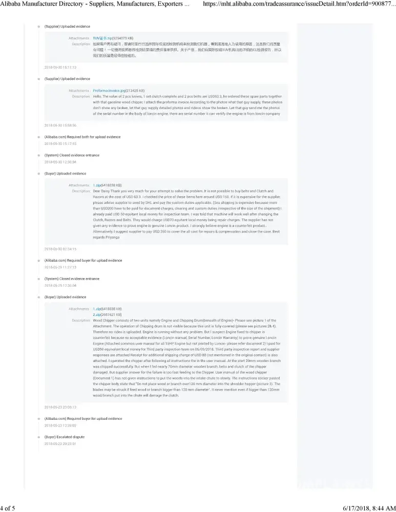 This product was defective due to manufacturing defect and Engine fixed to the wood chipper appears to be defective. I made a complaint Alibaba Trade Dispute Mediation Department on 17/05/2018.The complaint was investigated under the Trade Assurance Order No.[protected].