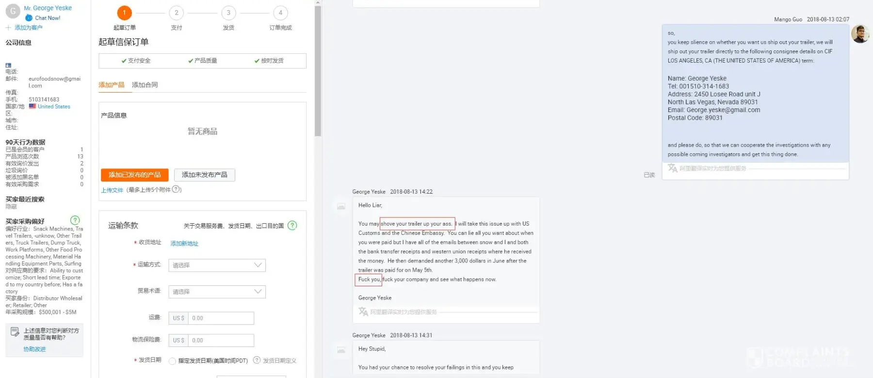 5. George gets delay for over 6 months and I didn't complain to him. but we were busy moving the factory, so I told him we will ship the trailer in 20days. But he can't accept that and ask to cancel the order.