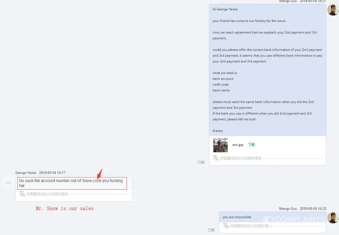 Stay away from Alibaba and this vendor. Alibaba will not support an American over the word of a Chinese.