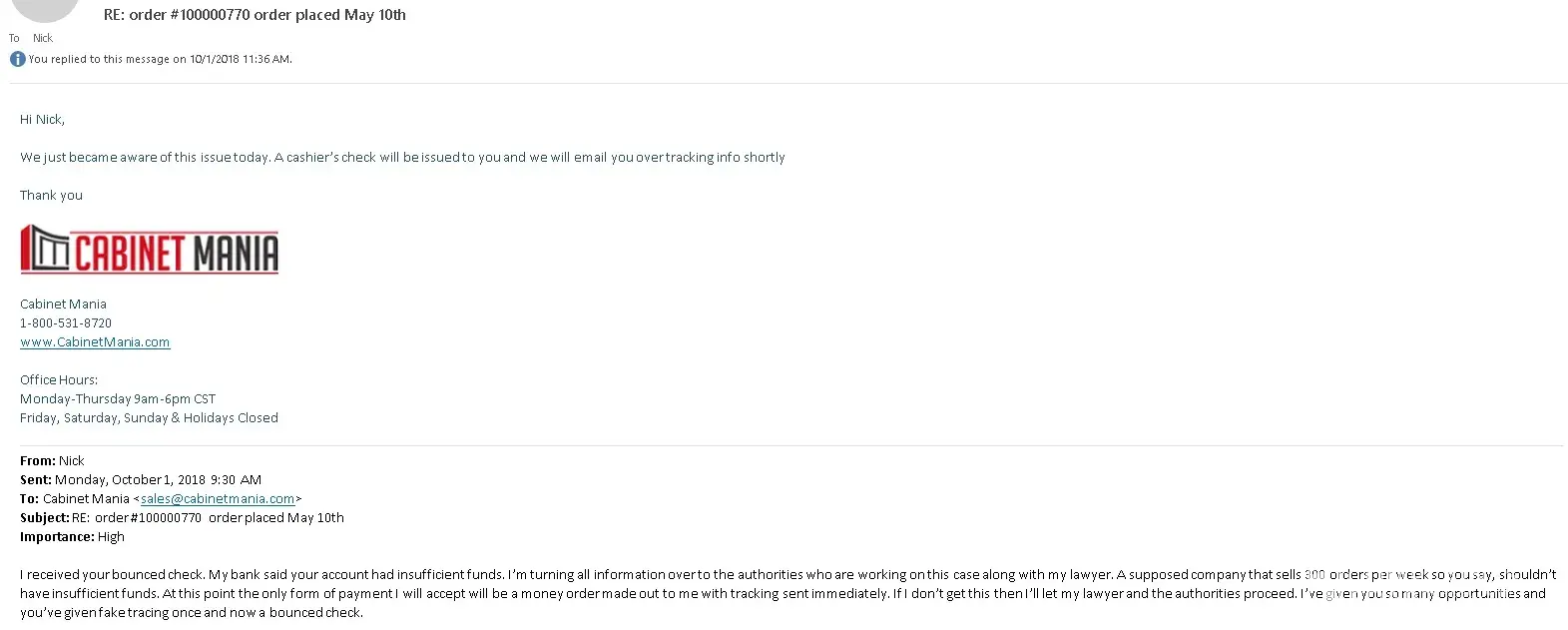 11. March 16th, informed Cabinet Mania LLC the check was NOT good, they said they had a customer bouce 2 large checks on them and they would get us a cashiers check delivered to us via Fedex and we would receive it by the coming Tuesday. Which would have been 3/21/18 . It never came and Fedex says that is not a good tracking number that Cabinet Mania gave us.