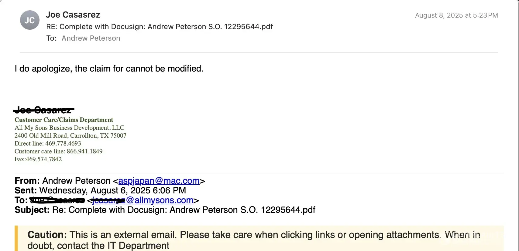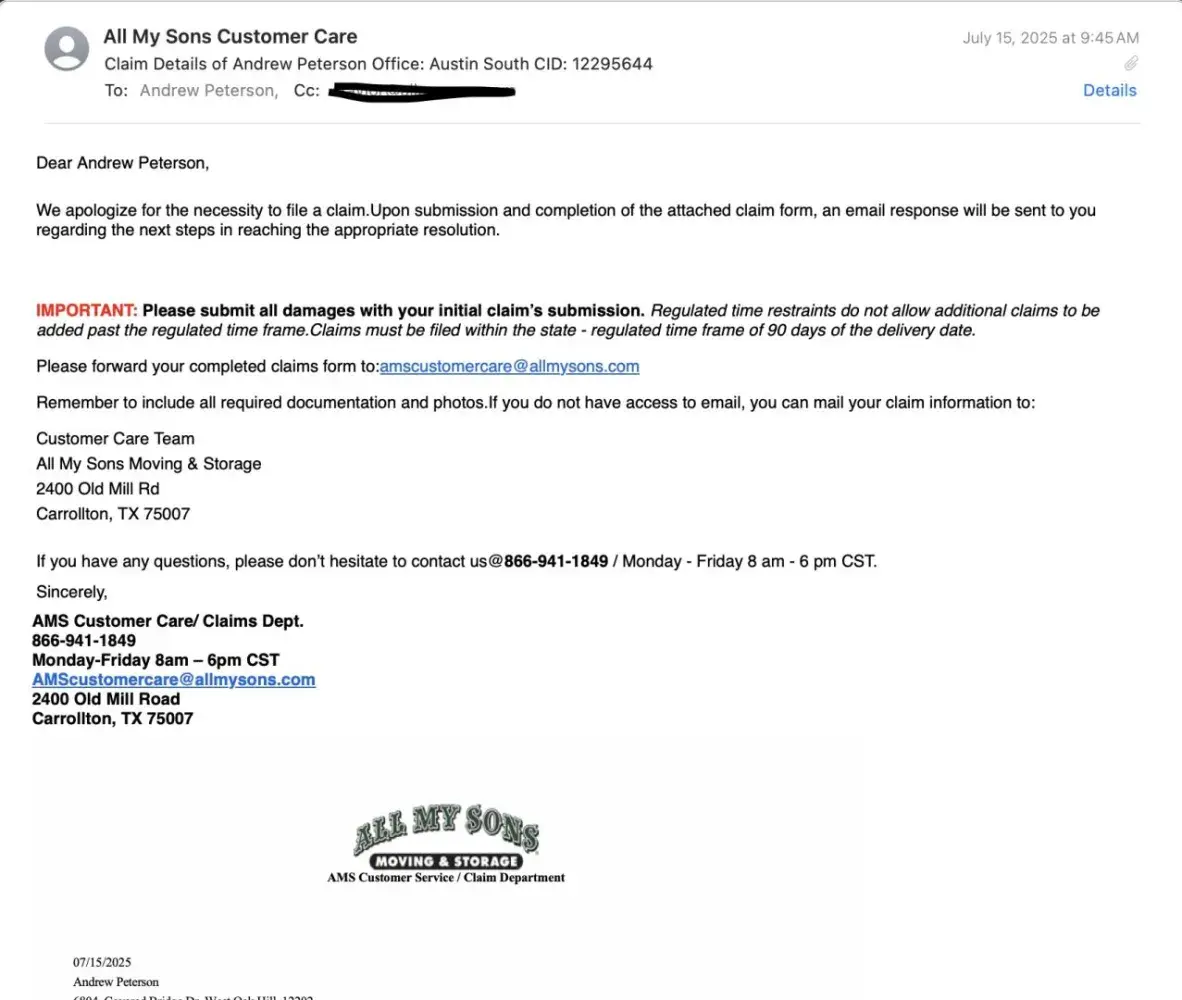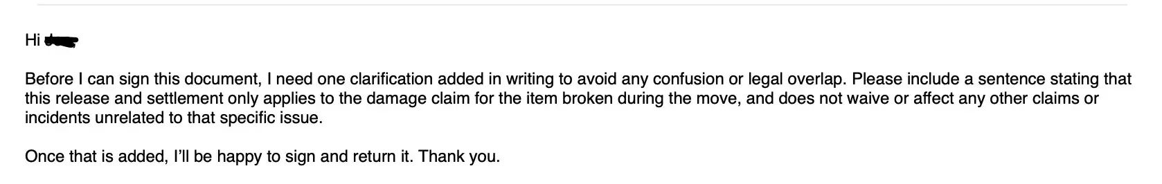 In addition, our property was damaged during the move. When I filed a damage claim, the company sent me a settlement agreement with an overly broad non-disparagement clause — a gag clause — that would have prevented us from speaking publicly about our experience. I asked them in writing to revise the clause so it applied only to the damaged item. They refused. I declined to sign, and they cut off communication entirely.