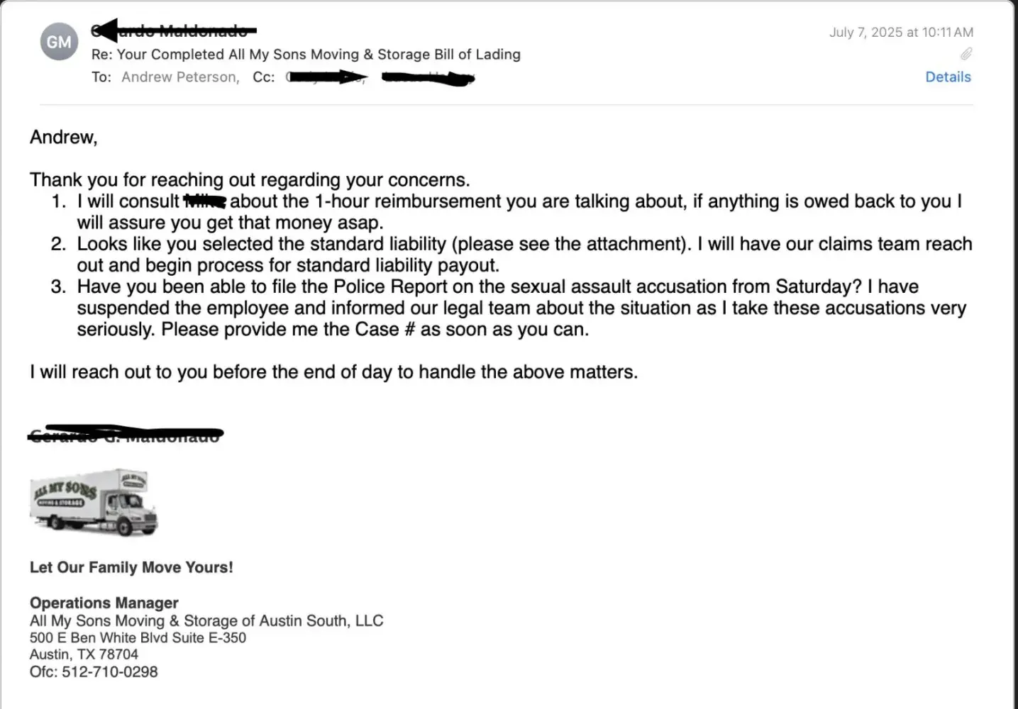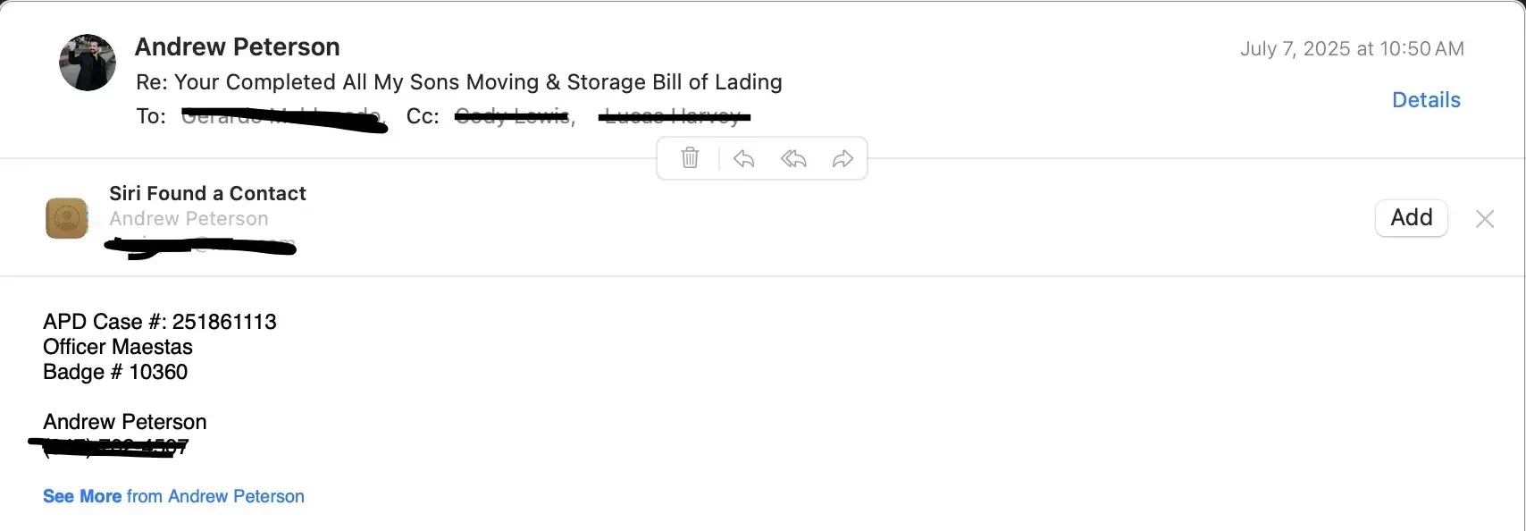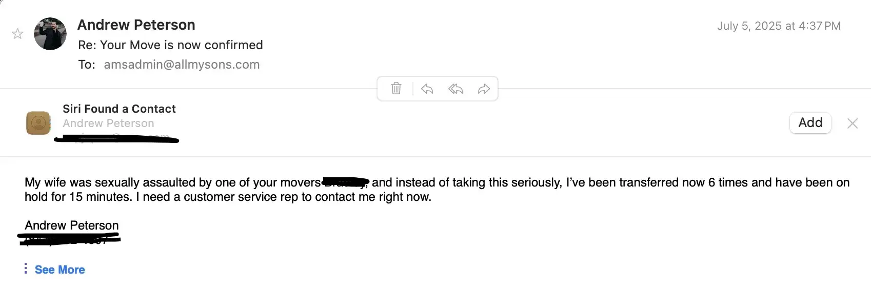 On July 5, 2025, during our move with All My Sons Moving & Storage – Austin South, one of their movers sexually assaulted my wife by making non-consensual physical contact while she was alone in a room. She immediately called me, and we filed a police report that day. The Austin Police Department investigated, and the case is now filed in Austin Municipal Court as a Class C misdemeanor.