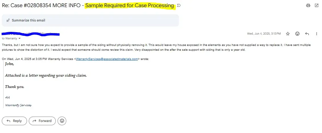 I have filed a claim ([protected]) w/Alside and followed it up with an email to [protected]@associatedmaterials.com and I have not received any response in weeks. I have a broken window with a lifetime warranty. Alside had previously sent me (on my initial claim) something in the mail w/o any instructions on what needed done. I think they were expecting me to repair the window without any direction. I have since filed a 2nd claim as I feel the window should be replaced OR adequate instructions and materials should be provided if they are expecting me to repair the window myself.