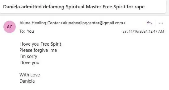 We are not recommending Aluna Healing Center to anyone and we are working to bring ourselves into full compliance with our legal obligations. In response to an earlier Pre Action Protocol legal letter we have had Han Maasland remove all of the offending posts about the Spiritual Master. We accept the posts were defamatory, false and malicious and we are not in agreement with Han Maasland's actions.