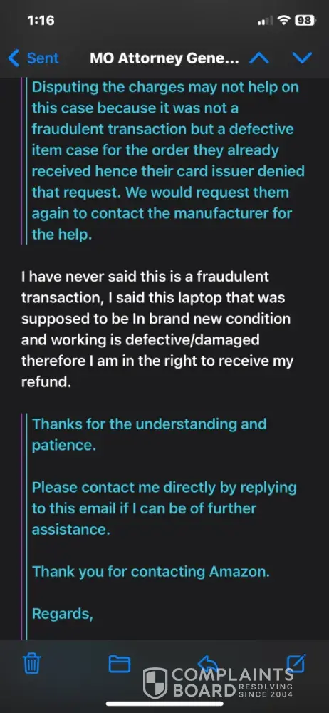 I Paid $438.64 for a Lenovo Laptop from Amazon the Order Number is [protected] then once the Brand New Lenovo Laptop had arrive to my house I had opened the package and to my surprise I seen a big damage dent on my Brand New Lenovo Laptop (As Shown in the Photo Circle in Red) Then 2 weeks after I had received the Lenovo Laptop on Wednesday June 7, 2023 it started having issues such as not turning on properly sometimes and having this error consistently popping up in my screen saying that “Your device ran into a problem and needs to restart. We're just collecting some error info, and then we'll restart for you.” (As Shown in the Photo) But unfortunately this keeps happening even till this day. So I contacted PayPal to Dispute this $438.64 Transaction on July 10, 2023 (As Shown in the Picture) so I can get my money back because the Lenovo Laptop is damaged. so for the meanwhile I was doing my part by submitting multiple evidence to get this $438.64 dispute claim close in my favor, but unfortunately PayPal denied and close my $438.64 Dispute claim on August 8, 2023 by claiming that they denied my $438.64 Dispute claim because this transaction was processed correctly (As Shown in the Picture). Which is irrelevant because the whole reason why I open this $438.64 Dispute claim with PayPal in the first place is to get my $438.64 back because My Brand New Lenovo Laptop is damaged not because the transaction wasn't processed correctly. So I made some complaints to Amazon then on January 14, 2024 I received a email response from one of the customer representatives from Amazon about my complaints (As Shown in the Picture) he claims this is not a fraudulent transaction but a defective item which is why my dispute claim keeps getting denied and I won’t get my refund but I keep making it clear that this a defective/damaged item not a fraudulent transaction. right after I said that the Amazon customer representative said a very generic sorry response and never reply back to me again (As Shown in the Picture)