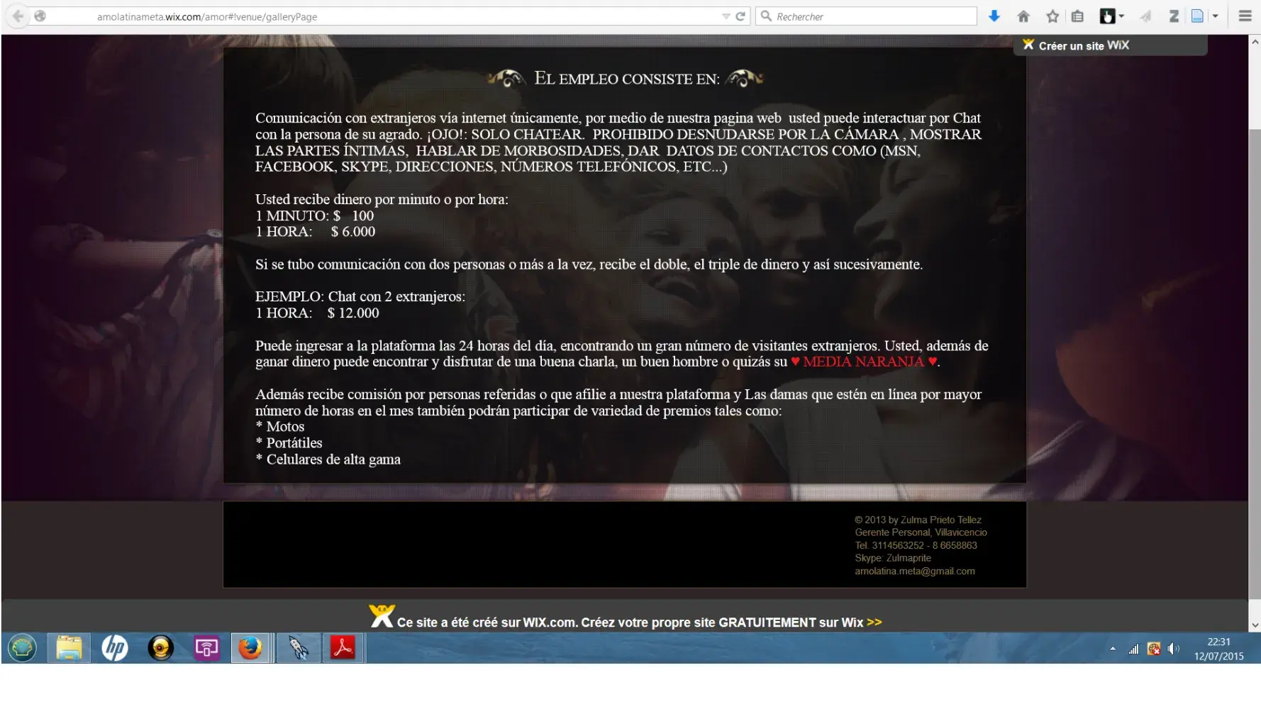 On exemple in spanish: The Web page in Colombia of the local agency : they recruit pay woman from 18 to 41 to chat with man 1 mn = 100 pesos. They can chat with 10 men a the same time and tehy are paid x10 and they are not allowed to exchange email adress or skype or Face book.