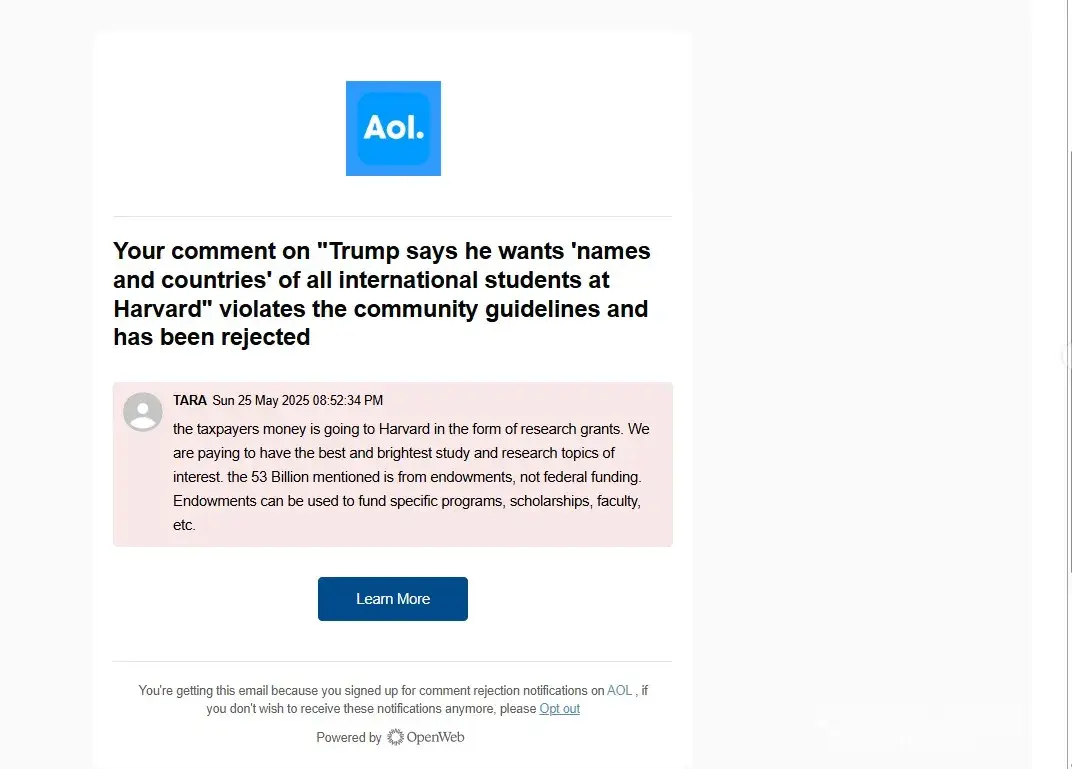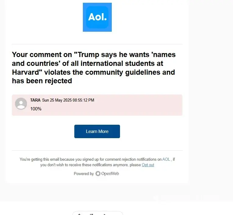 Every single one of my comments has been removed for violating community guidelines. Even ones that simply say "100%". I have contacted AOL support and they are clueless and can't help. I have tried to contract OpenWeb (where the notifications are coming from) but can't seem to get the contact page to work. Does anyone have the same issues? If so, how did you resolve them?