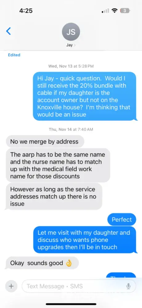 My name is M. I signed up for internet in Knoxville, Tennessee for my son approximately three weeks ago. While getting the internet installed, an AT&T Sr. Associate In-home Expert (Jay S) came to sell me AT&T mobile services. I told Jay S, I was not interested in converting to AT&T, but he was determined. Mr. S asked about my current mobile bill and said if anyone in my family was in the military or healthcare industry. I told him my daughter was a nurse and he replied it would be a significantly better deal than what I was receiving through Verizon. He also explained if I purchased an AARP account, I would receive an additional discount stacked on the healthcare discount. He also said AARP provides insurance for phones of up to four claims a year so there is no need for me to purchase additional insurance through AT&T.