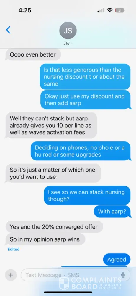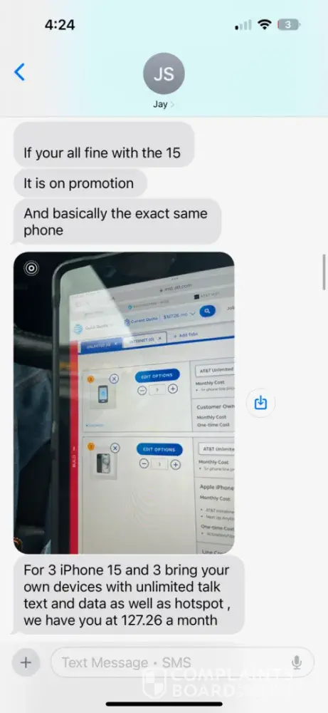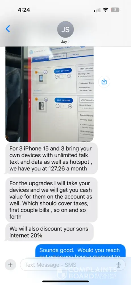 Mr. S promised me a rate of $127.26 plus taxes for six lines with three phones ported over and three lines with trade-ins of iphone 13 to iphone 15 with all discounts applied and three upgraded phones. I have witnesses to attest the following as well as text snapshots from his AT&T work phone to show what was promised to me. I will attach a few of the text pictures to this e-mail. Mr. S also claimed I could get the combined (wireless and internet) discount as long as my daughter and I used the same address - I explicitly asked if our names being on the accounts being different would pose an issue to which he said no (text shot attached). NOW, here is the issue, I get a monthly bill for $330 with none of the promised discounts. In addition, he said I would receive $880 in trade-in phone credits but in reality I received $570. Also, on my bill today he applied phone insurance to my account and the option for yearly upgrades. Which I did not ask for or approve. It appears Mr. S was stacking options to help with his commissions as adding this makes no sense since he said previously the insurance wasn't needed with AARP. As I stated, he said AARP would cover the four claims a year, but now I found today it doesn't.
