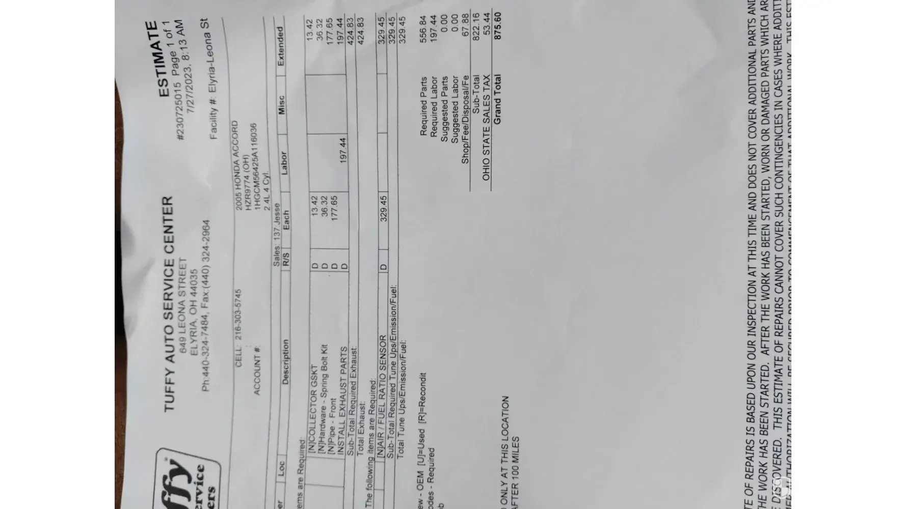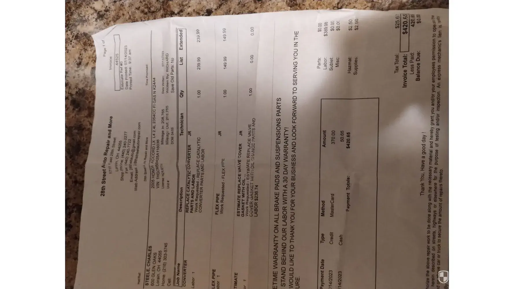 On July 14,2023 I took my vehicle to the above auto repair shop to have my Catalytic converter and flex pipe replaced for $420.65. When the repair was done on my way home I noticed that I still had an exhaust leak. I immediately turned around and took my vehicle back to the shop. After sitting in the waiting room for about 45 minutes the technician came out...