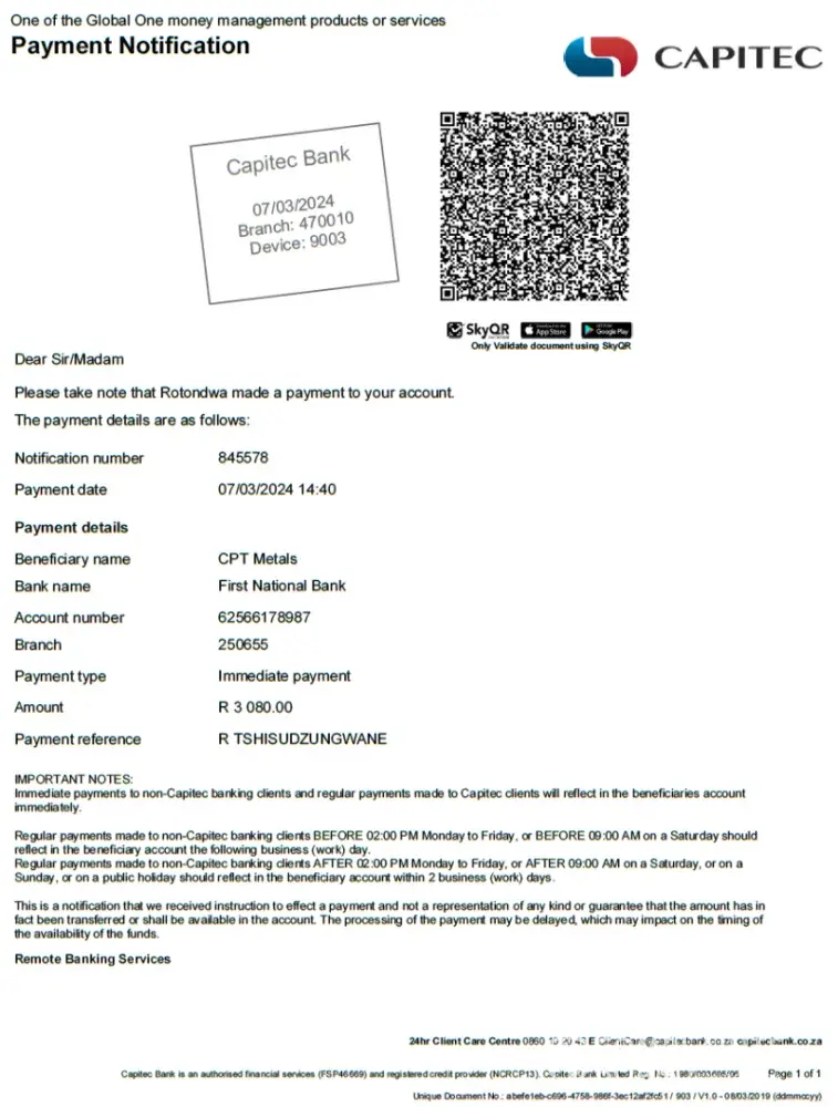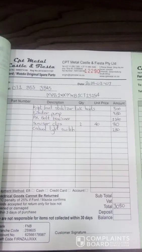 Good day, I contacted the above-mentioned company with regards to the purchase of the above-mentioned parts on 07 March 2024 and also them the VIN Number for the car. They sent me a quote (see attached) and was promised that the parts will be available for collection on 09 March 2024. I paid same time without hesitation (see attached proof of payment...