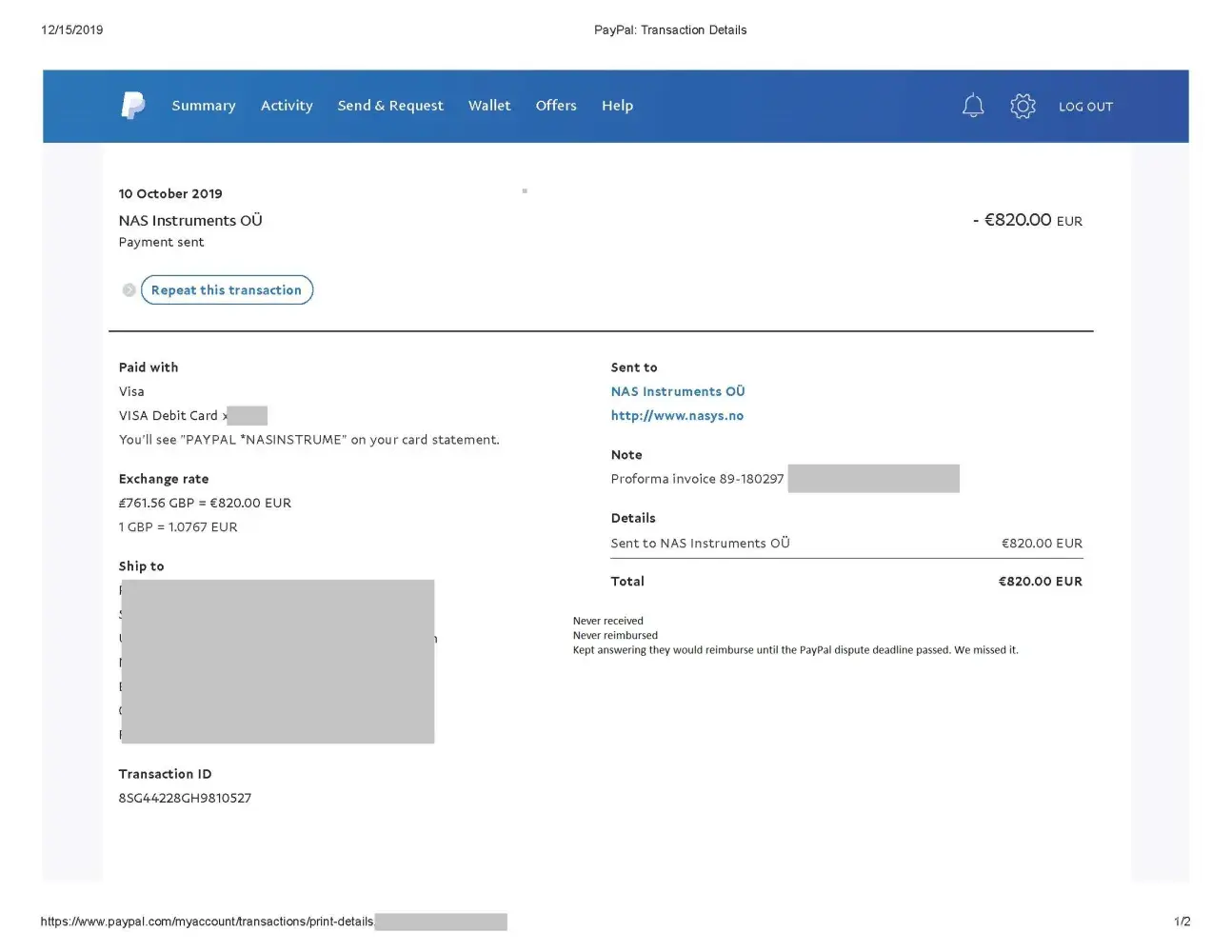 Ordered and paid a LoraWan gateway on October 10, 2019. The order was immediately confirmed for €820.00 (EUR). We tried to get a delivery date estimation. We kept receiving excuses for delays after delays. Eventually, the supplier could not give any estimates anymore. We had no choice but to cancel the order in December 2019 and to request reimbursement...