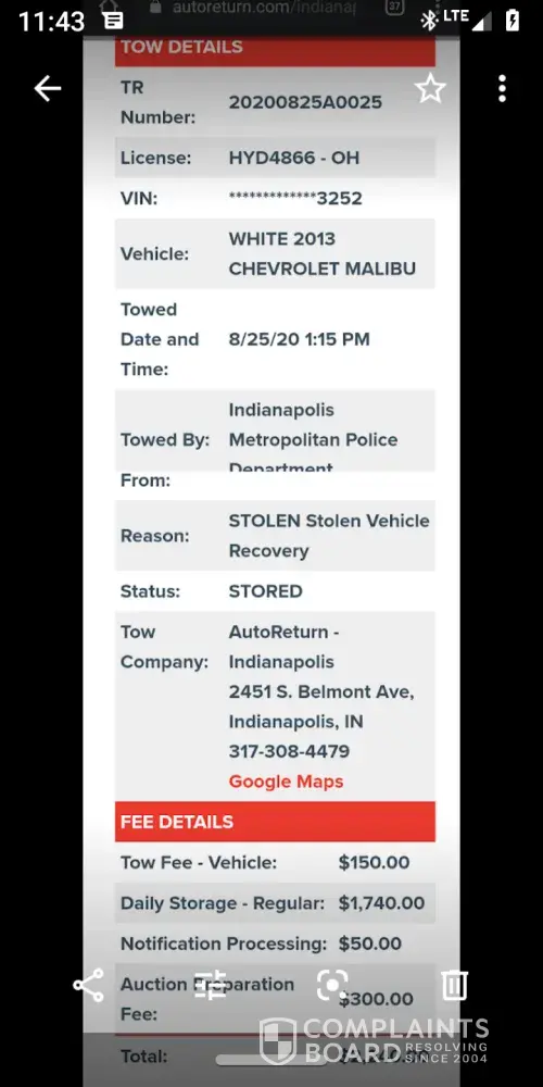 My car was stolen from a hospital in Troy ohio. This happened on 8/20/20. I made a police report. The car was then recovered on 8/25/20 in marion county Indiana. The car was towed to the Autoreturn. They charged 150 for tow, and 30 dollars a day for fees. The car is now over 2500.00 to get back. I have contacted Autoreturn many times to try and negotiate...