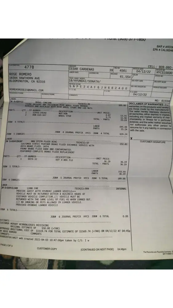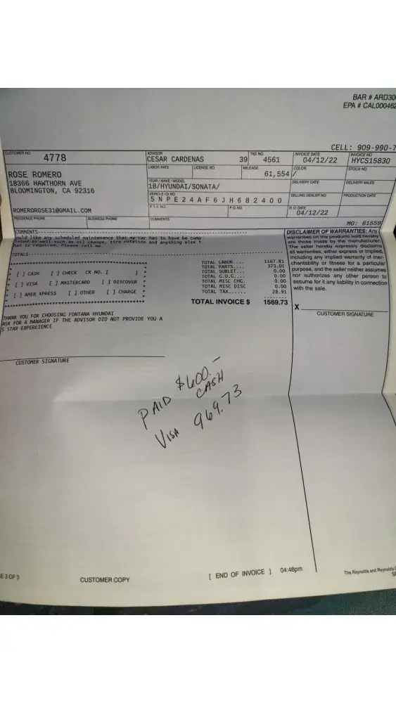 Read full complaintFontana Hyundai - Auto repair service causing expensive damage