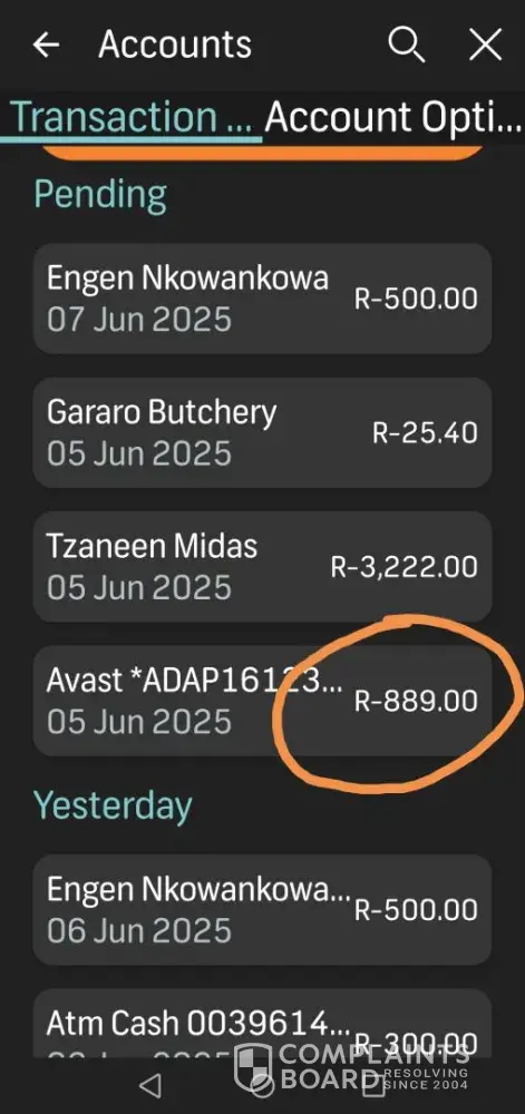 Claimed loss: I notice a debit of the amount of R889 in my bank account. A reference number for the debit is Avast*ADAP160239322. It was done on 5th June 2025. When I check on the system it lokks like you will debit again in July.