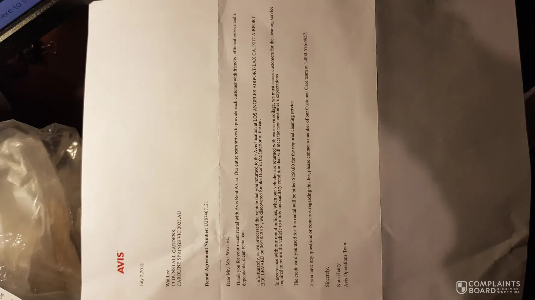 I received a letter from AVIS dated 2 July 2018 for a charge of $250.00 to my credit card for the cleaning service for smoke odor.