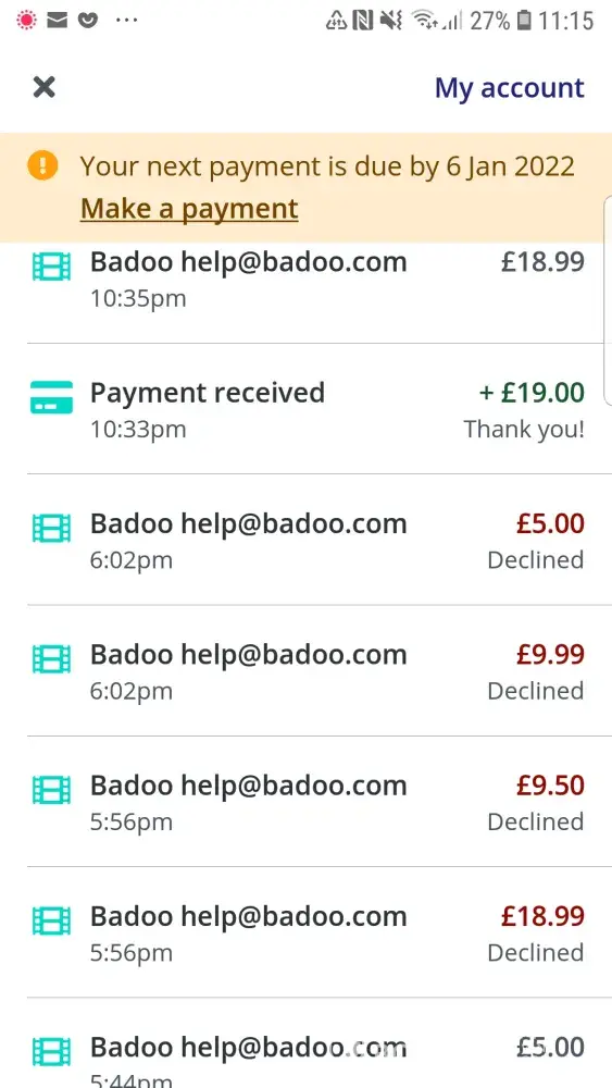 I have been getting $3.49 charges on my card since 12/20/21. They charged me twice on that day and it kept going up to 12/26/21. I do not have an account with Badoo. I even tried to sign in to the account and have them send me a new password if my email was on file. It isn't. They are charging me for services I have never signed up for. I am going straight to my attorney as soon as he gets back from vacation on 12/28/21 because this is [censored]. Badoo, if you are seeing this, get back to me with my refund of $27.92. The bad part was that they charged me twice on 12/20/21. WTF!
