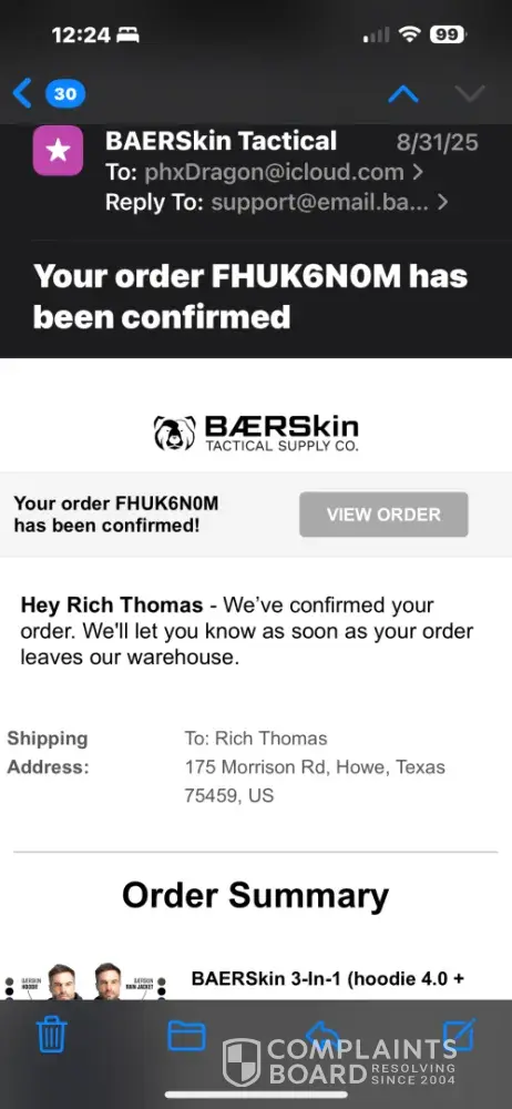 I ordered the hoodie and rain jacket from Baerskin Tactical on November 14th 2025. I did not get my order in the time frame that I was told which is 2-9 days after order confirmation. So I contacted them to cancel my order. I was sent an email stating that one of my items was a pre- order which they did not inform me of this when I placed my order. I once...