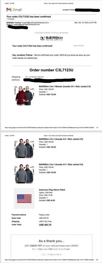 Order# CM38N6JQ Ordered on November 9th 2024. I messaged on the chat they had available on the site to get tracking info in late November, December 9th, December 27th and January 4th all replied with the same email. Hi First off, let us say: you're a legend for ordering with us. We truly value customer feedback - it's what makes BAERSkin, well...