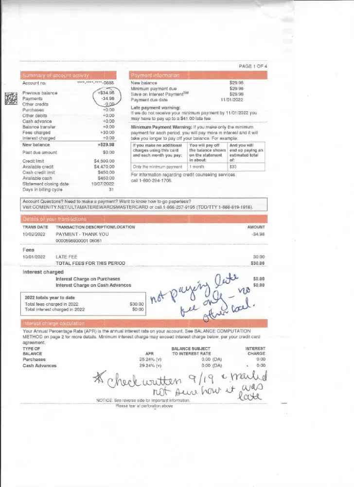 I received a bill in Sept. 2022 for 34.98, due Oct. 1. I wrote the check Sept. 19, and mailed within a day or so. This is a time period of 13 days, therefore there is no reason why they did not receive on the day required for on time payment. I received another bill, due Nov. 1, showing the payment received Oct. 2, paid in full. But they charged me a late...