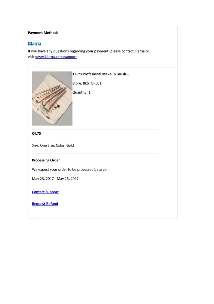Hello Wish Team, I am Yampang K. Danielle writing all the way from Germany. I ordered a set of make-up brushes which is described in the following way on your website: 12Pcs Profesional Makeup Brush Set Synthetic Foundation Powder Blush Eyeliner Brushes Pincel Maquiagem (Taille : Taille unique, Couleur : Doré) I bought this and a pair of shoe and...