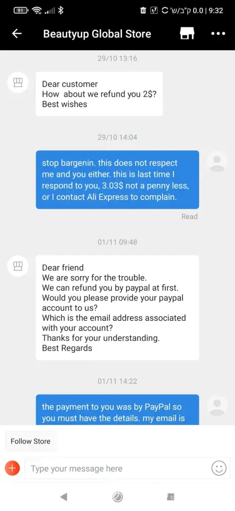 seller does not seem that he is going to refund me. he sends me stupid answers, sends me imujies. Such a supplier cant be on your list of suppliers. Please resolve the isuue, we are talking on a refund of 2.97$. The bigger issue is the supplier's response.