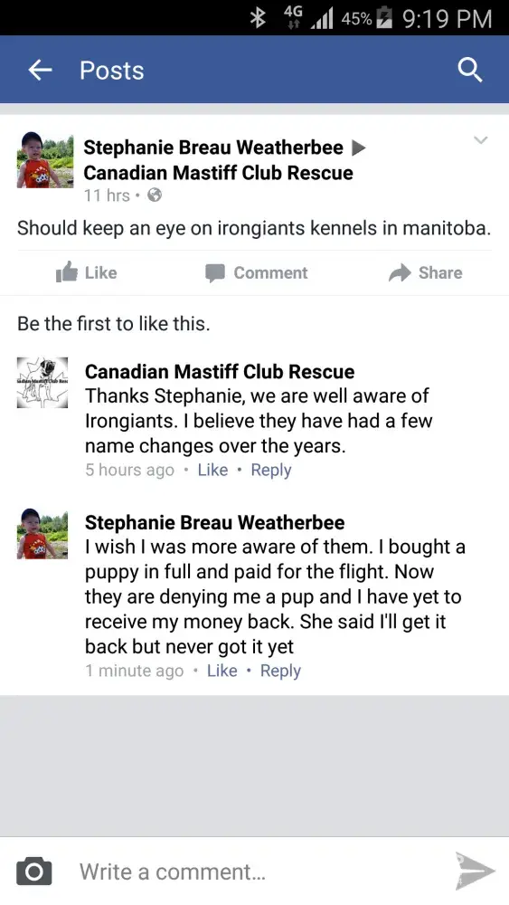Never buy A pup from these people. BEWARE! They try to steal your money and from the looks of it had numerous name changes over the years, because I assume this isn't their first time ripping people off. She runs a puppy mill. She does it for the money and not the love of the dog and breed. I hope they do sell their business so hopefully someone trust worthy and caring buys it. All these dogs and had the nerve to say I wouldn't be a good person for one of the pups. Kept telling me she did me favor by selling me a pup at a lower price when she could have easily got more for it. Mean while I'm sure all these dogs don't get the love and attention they need. They are all part of her assembly line. People like this make me sick. I feel bad for dogs. Con artist. Stay away from Iron Giants Kennels in Manitoba and do your research before you purchase a pup from a "Breeder". Never know when they will change their name again.